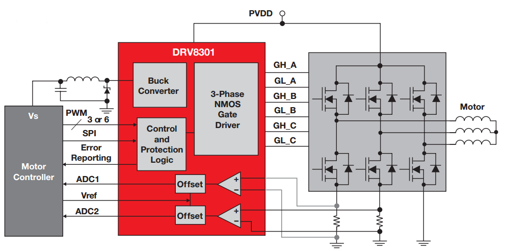 - 集成型三相栅极驱动器,具备双电流分路放大器和降压型转换器,旨在满足MCU或系统供电需求