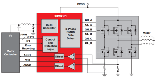 利用一个集成型驱动级、电流检测、片上控制逻辑、简单的控制接口、易用型EVM和协同设计文档.客户能够迅速地完成其电机的设置并使之进入运转状态。
