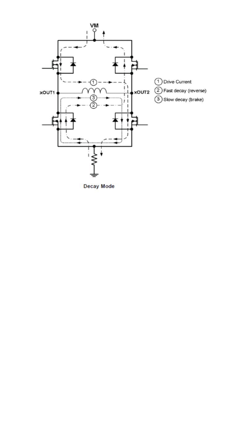 • DRV8412内部没有自带Decay功能,所以可以通过外部PWM控制来实现。如下图,在每个PWM周期里,先是打开对应FET来驱动线圈,然后关掉FET来续流,在续流时间内,选择是2-Fast Decay还是3-Slow Decay。2就是反向的上下管FET打开,3就是全下管FET打开。