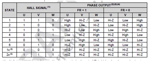 2、换相信号问题,DataSheet给出了30°放置霍尔传感器时梯形波应用下的换相逻辑顺序,然而0°即表2并没有给出,那么0°的换相顺序应该是怎样,同样无霍尔传感器应用背景下,应该如何换相,换相顺序是怎么样的?