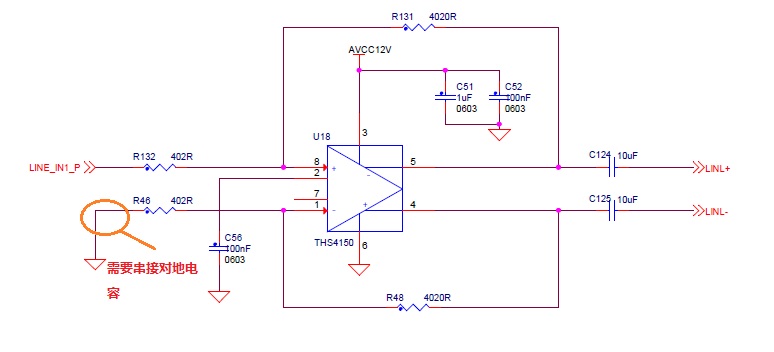 用THS4150的作为麦克风输入单端转差分的单电源方案,供电为12V,gain为40dB,按照芯片的手册Figure 32.Fully Differential Amplifier Using a Single-Supply连接,之前用Tina-TI来仿真没问题,但是实际电路上电发现芯片就输出失真,后在反向输入端的R(g)对地串了个电容,这样芯片才能正常工作,难道Figure 32.的参考设计有问题?