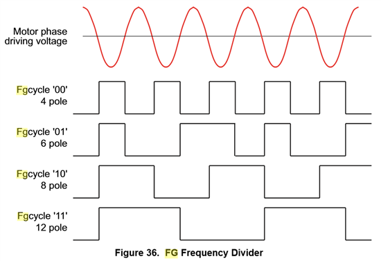 datasheet之所以强调FG和motor pole的关系是为了配合有些应用场合必须要求一个机械360°输出2个FG脉冲,比如这个电机是4极的,那我可以设置成第1种情况,那么一个机械360°是两个电360°,输出2个FG脉冲。