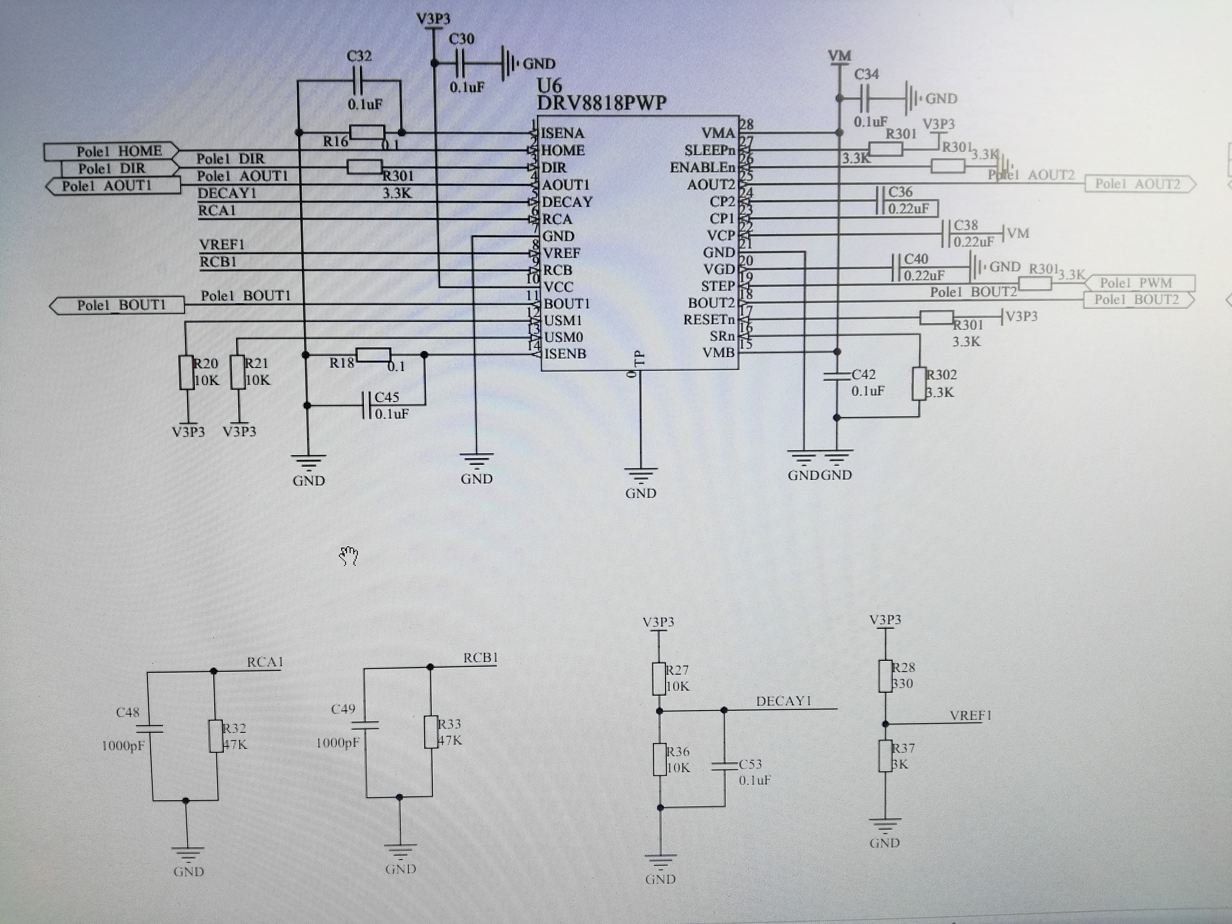 使用DRV8818驱动步进电机,电路图下面, 电机静止时A+B+有脉冲输出,A-,B-没有,当给PWM信号时,转动时脉冲输出不连续一会有一会没有。