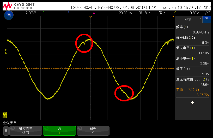 如下图,图中红圈处两个异常尖峰,每个周期都有,换了不同的旋变也有。同样的旋变,我们用之前的AD2S1200的励磁波形就没有这个畸变。