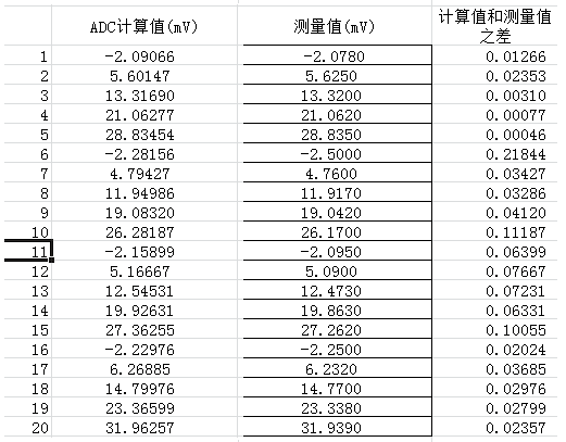 第二列为 使用ADC转换后的数字值 计算出来的传感器输出电压值;
