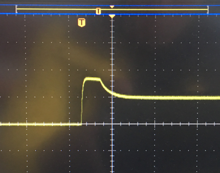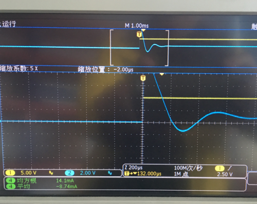 电压模式:10V输入1V输出上升时的波形,下降沿也有过冲。黄色是输入、蓝色是输出。