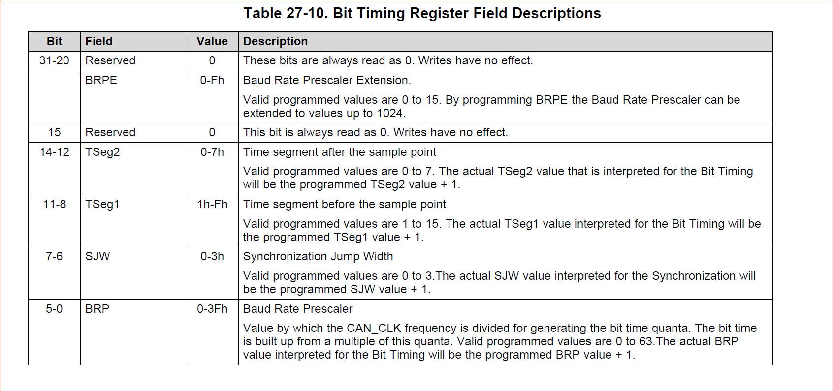 我是这样理解的 BRP和BRPE将CAN的时钟进行分频分频值从0到1024,假如CAN 的时钟是80MHz, BRP设置为7,此时 CAN 的波特率就是80MHz/(7+1)=10MHz, BRPE = 9,此时就是将经过BRP分频后的CAN时钟频率再次进行分频 10MHz/(9+1)=1MHz。我这样理解对嘛?