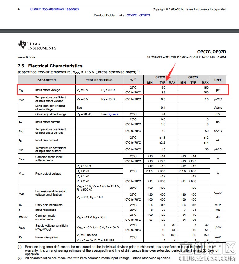 运放OP07CDR sop-8数据手册中offset没有标MAX.值
