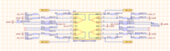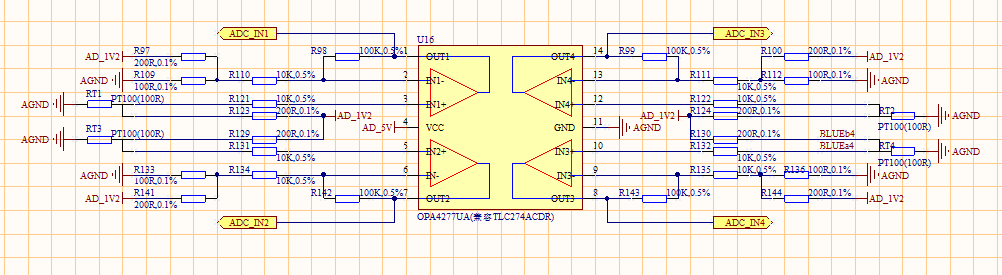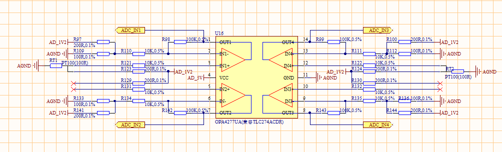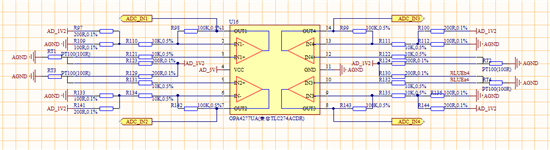 如上图所示,RT1、RT2、RT3、RT4为温度传感器PT100,我们在室温测试(PT100电阻值为:113.6R)时发现: