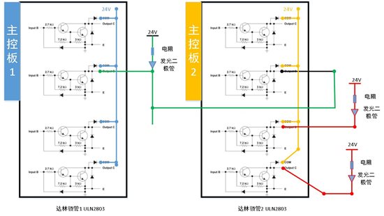 目的:两片ULN2803其中各一个通道,同时控制一路LED灯,两块主控板都可以点亮LED灯;当主控板1和主控板2都上电,控制信号正常。两个主控制都可以点亮LED。