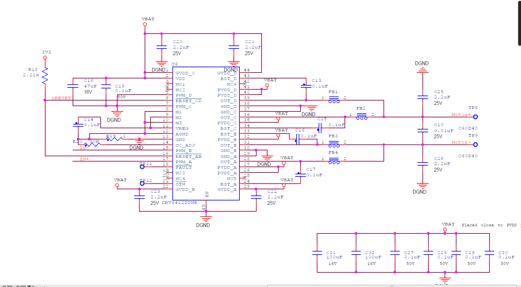 我用一片DRV8412驱动直流电机,IN端加载40KHz 90%占空比的方波。OC_ADJ上电阻为120K OHM.