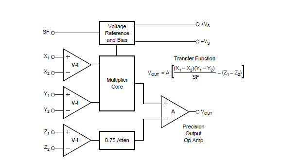 如果输出即为简单的两个相乘,那么Vout=(X1-X2)(Y1-Y2). 需要的配置首先SF=1,A=无穷大,Z1=Vout,Z2接地等于0.这样公式就变成