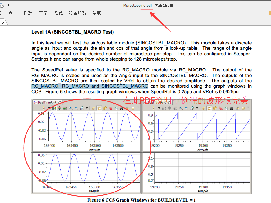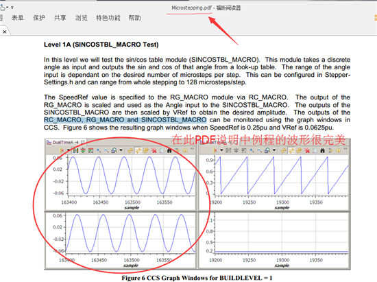 参照ControlSuit里面DRV8412-C2-KIT的例程做步进电机的驱动,按照例程里面的PDF走的话,发现程序里面SINCOSTBL_MACRO的输出不正常,RG_MACRO的话还能勉强看到是一个锯齿波,PDF上面显示的是一个标准的正弦波形,想问问论坛的大牛,做步进电机细分步的时候,这三个宏定义的含义和作用是什么? 还有我这个可能是什么原因?