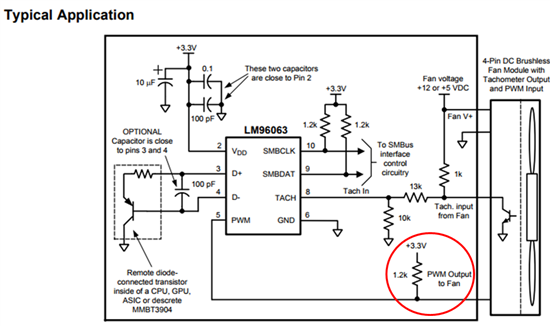 我想询问下LM96063的典型应用电路中,PIN5(PWM)为什么需要接上拉电压?如果风扇的内部有上拉电压的话,还需不需要接3.3V的上拉电压?