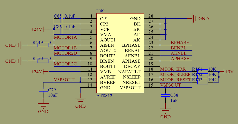原来使用AT8812芯片,由于电流问题,在PCB上更换成DRV8842,目前电路连接,I1,I2,I3,I4连接地,I0连接单片机管脚,采用24V供电,控制DRV8842的20和21管脚,测试没有输出, V3P3OUT没有输出。I0~I4是DAC控制,接地不行吗?