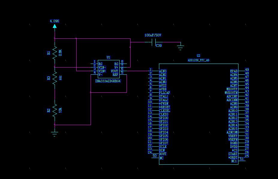 如题,电路目的是用电阻分压的方式来测量NTC电阻。分压电阻用0.002%的精密电阻,经过INA333后输入到AD,如图所示。