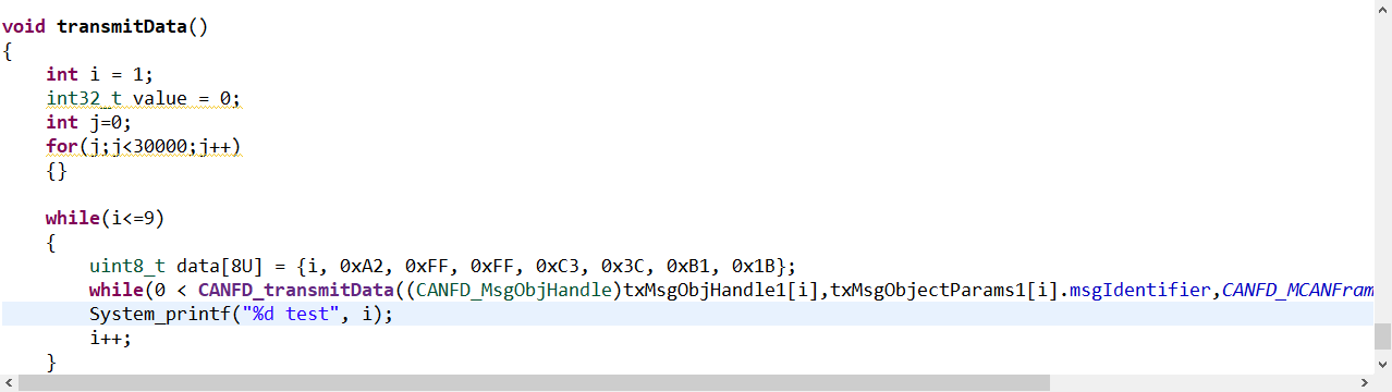 retVal = CANFD_transmitData (txMsgObjHandle, msg_id, CANFD_MCANFrameType_CLASSIC, 8U, &txmsg[index], &errCode);