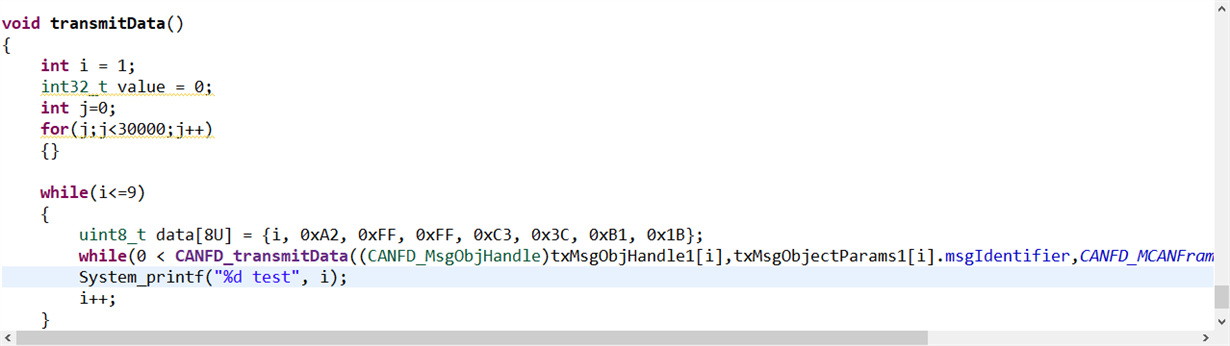 retVal = CANFD_transmitData (txMsgObjHandle, msg_id, CANFD_MCANFrameType_CLASSIC, len, &txmsg[index], &errCode);