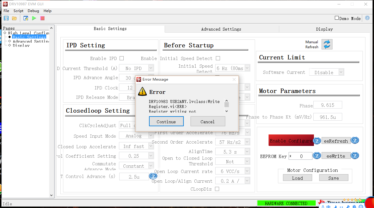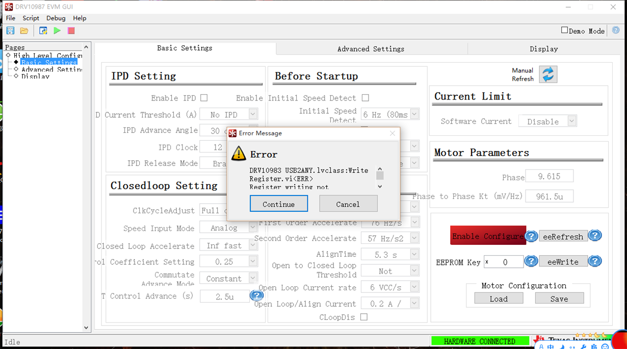 完全按照官方推荐的电路图和原理图做的板子,焊上DRV10983-Q1芯片后,上位机无法读写寄存器,芯片的1.8V引脚输出正常,3.3VLDO输出异常,大概电平掉至1.45V,5V输出的step-dowm也输出异常,只有800mv的电压,电感上电流没有在斩波,以为是芯片问题,换了芯片还是这样请问为什么?