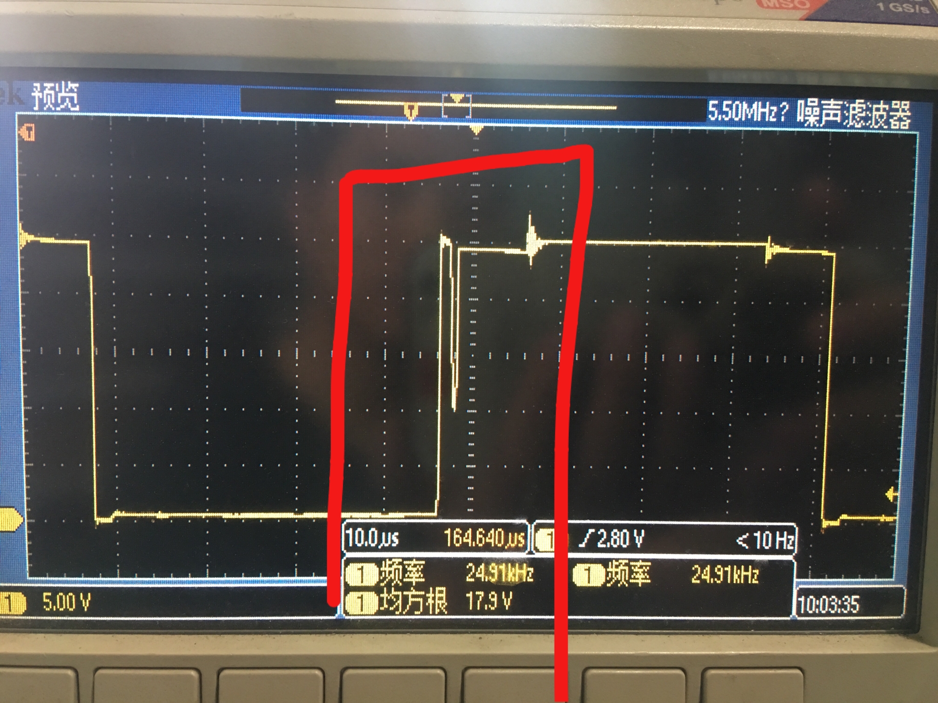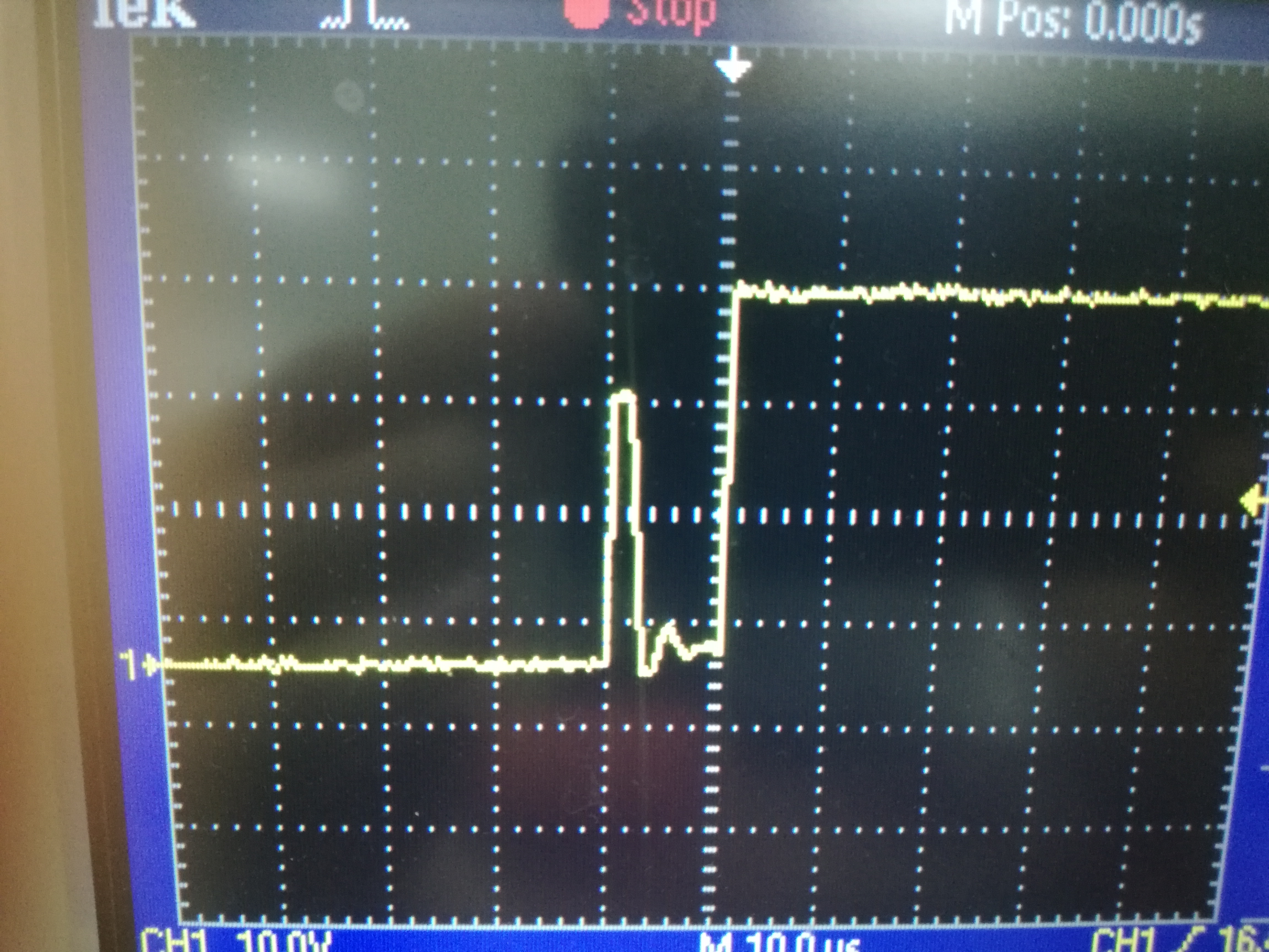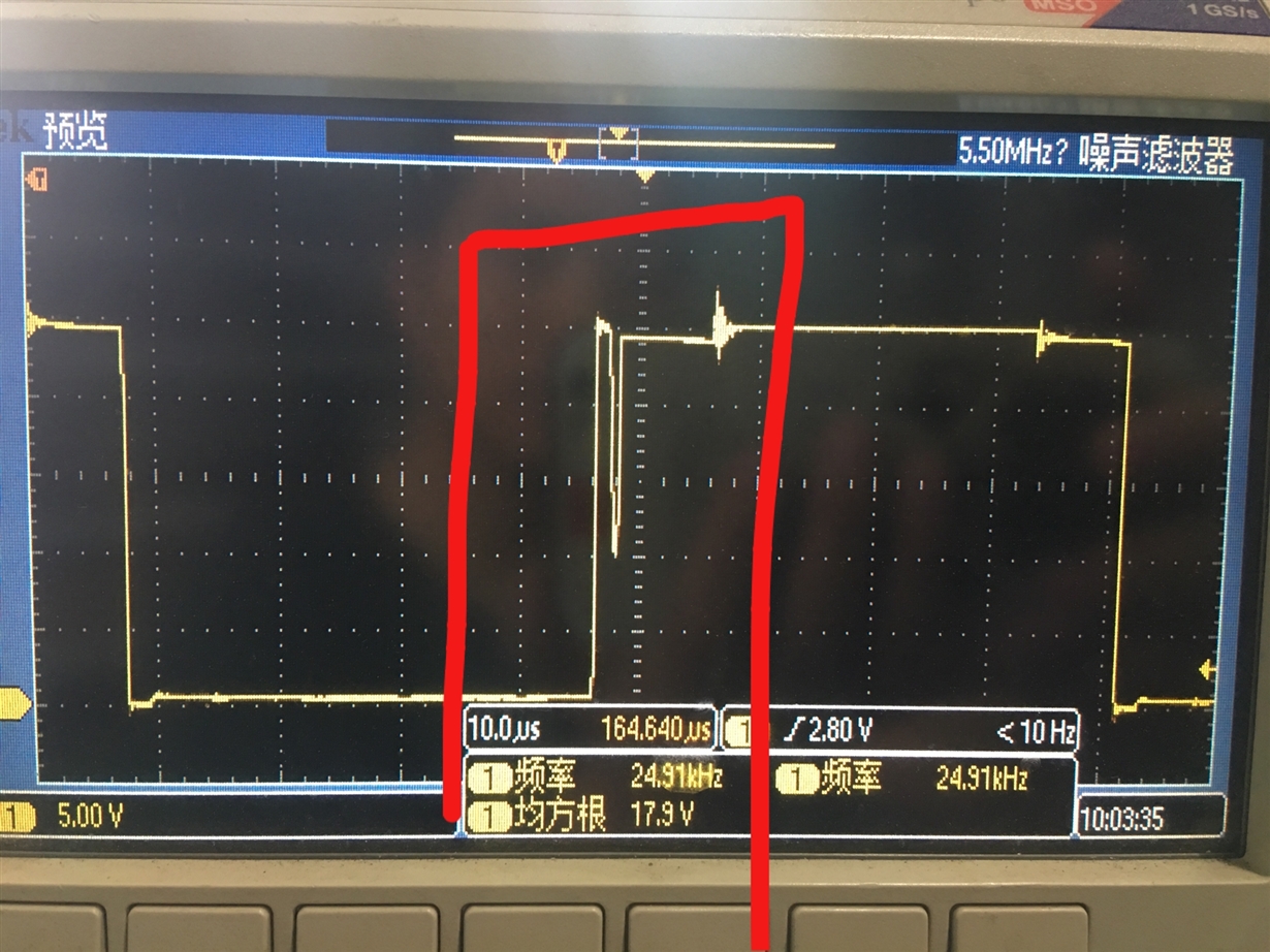 我在运用DRV8301做电机驱动的时候,电机的噪声较大,用示波器测得DRV8301输出的GH_A处的波形有一个脉冲,图形如下图所示,