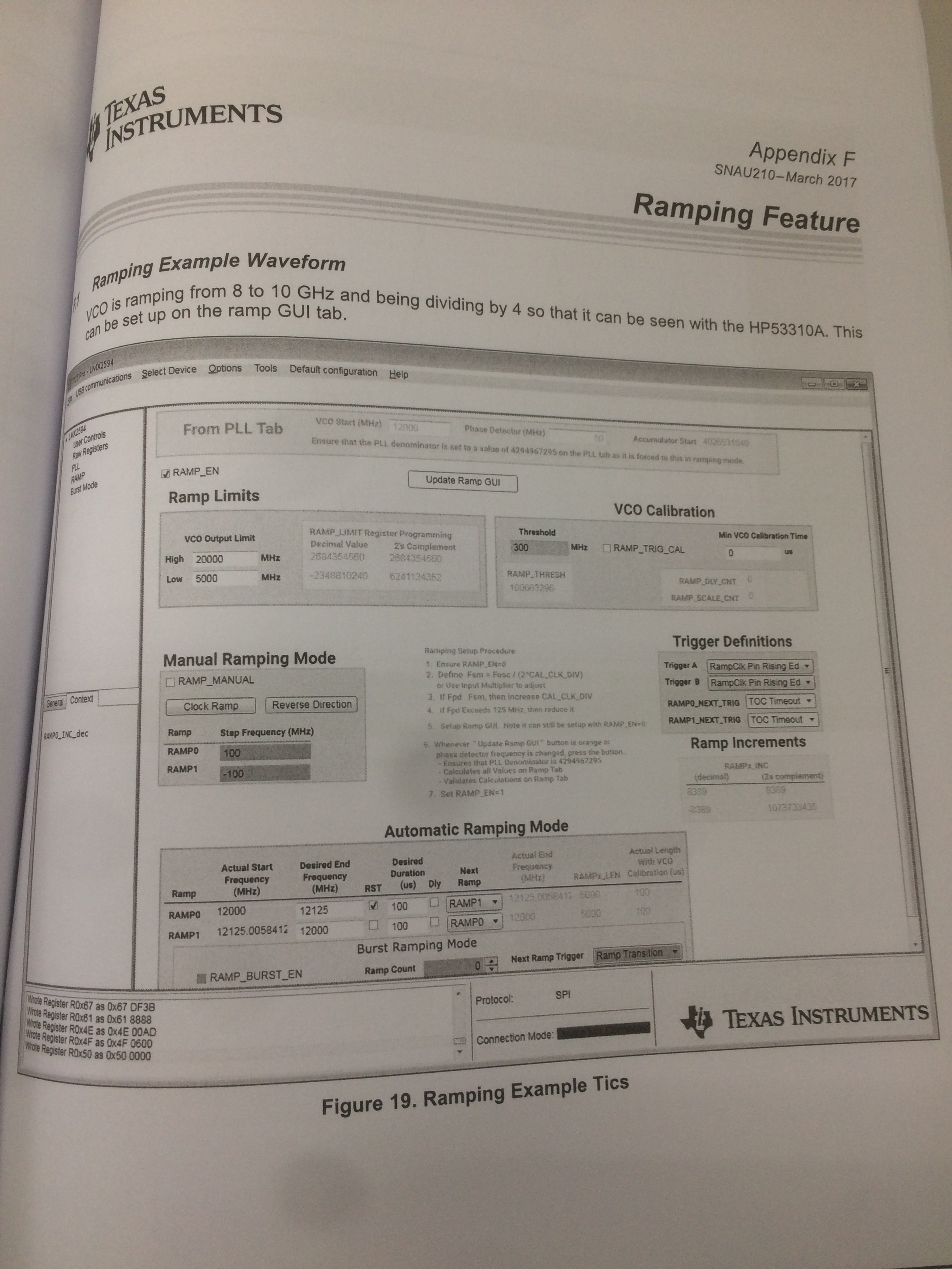这个是按评估板pdf文档EVM那个设置的,8-10GHz扫频,我按软件算出的寄存器设置,出不了EVM文档所显示的波形。