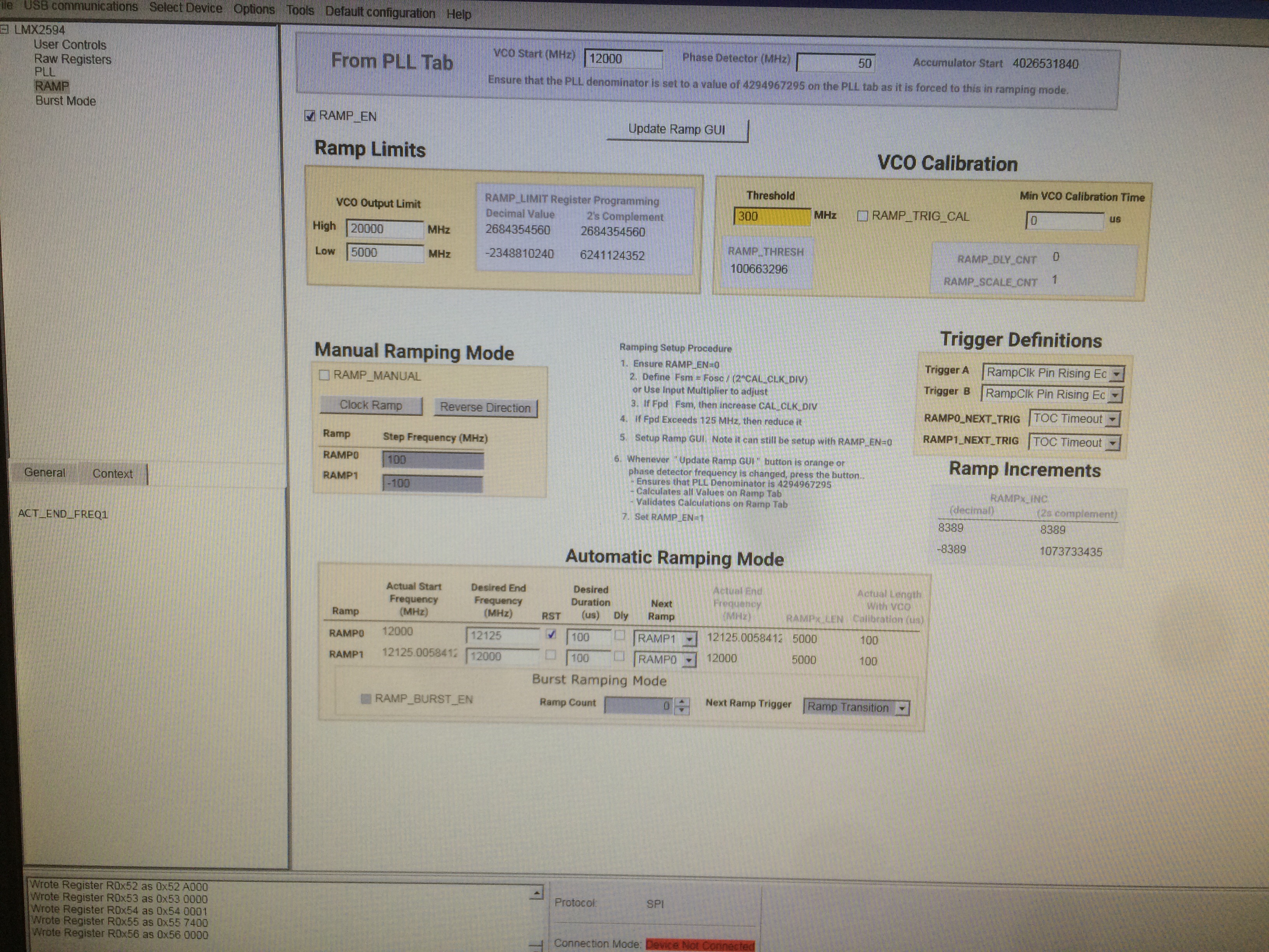 关于LMX2594扫频问题的请教,不扫频是怎么回事啊?我哪设置错了?我都是按软件抄写的寄存器啊