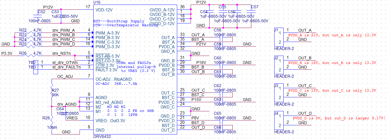 现在的一个 新 单板, 硬件设计 使用 四个 Half-bridge 模式 (M3 M2 M1 = 000)。送给 DRV8432 控制信号 PWM_A/B/C/D,但 相应送出 电压, 但 电压值 不对。