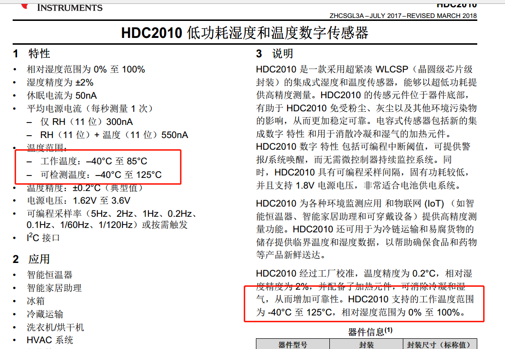 HDC2010为什么可检测温度会比工作温度还要宽?下面的另一个框的内内容又说工作范围在检测范围内?这是为什么?