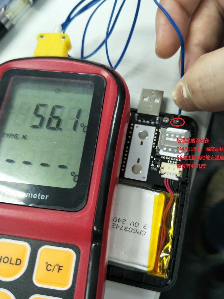 这是另外一台用TMP116做探头的设备,也有自发热问题,我们通过在电源上串了5.2欧姆的电阻测试得出芯片此时耗电是98.4mA