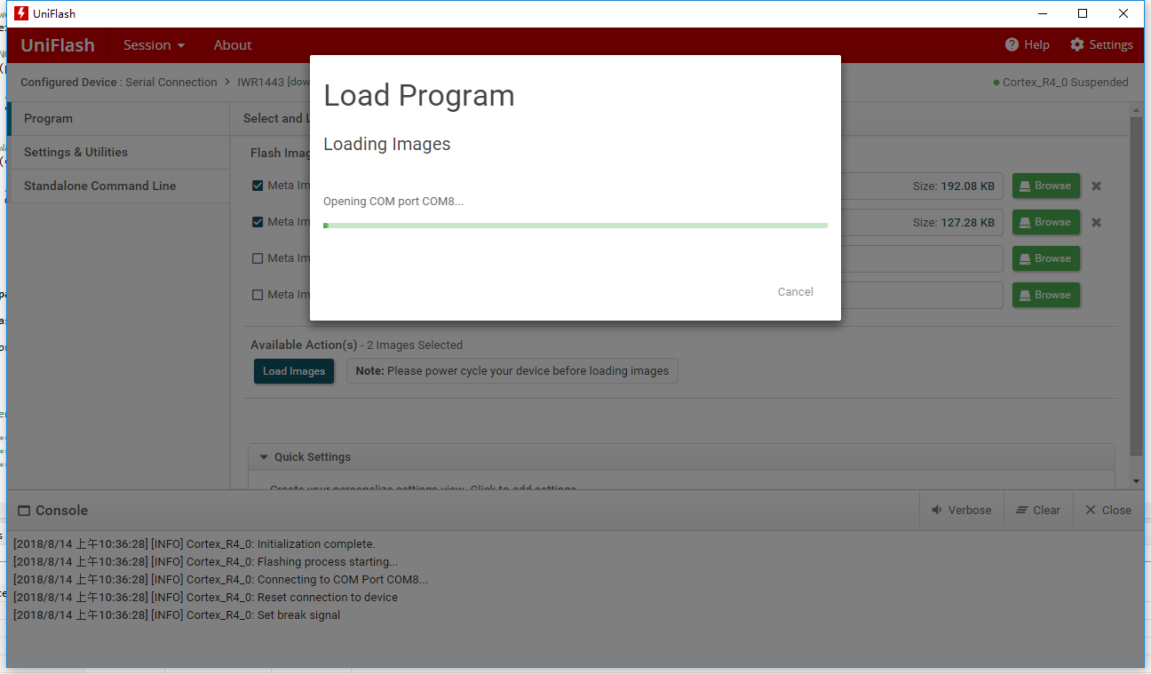 串口选择正确是串口8,但是点击load lmages 出现了下面的卡死情况,是不是烧录的bin文件不正确?