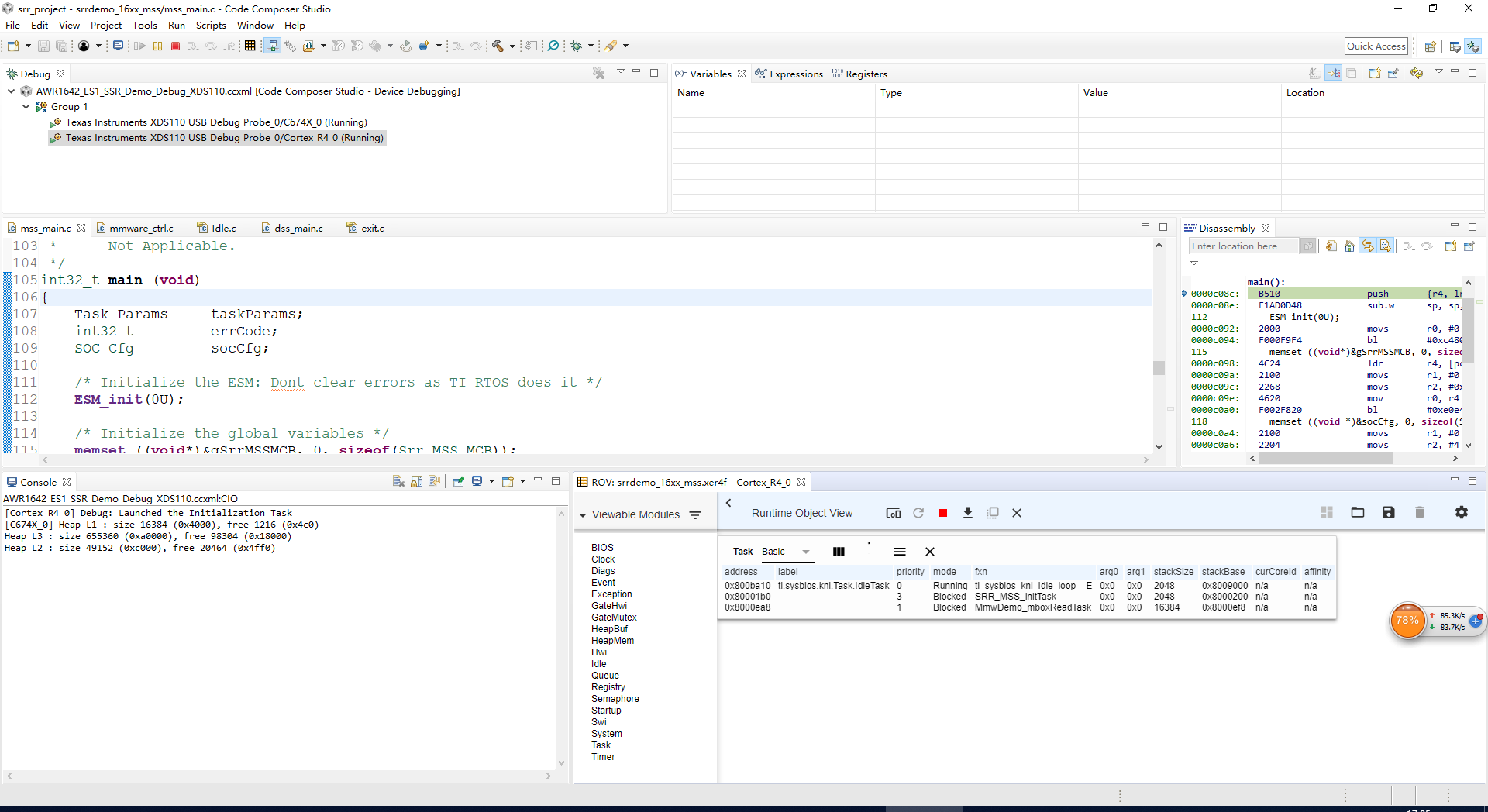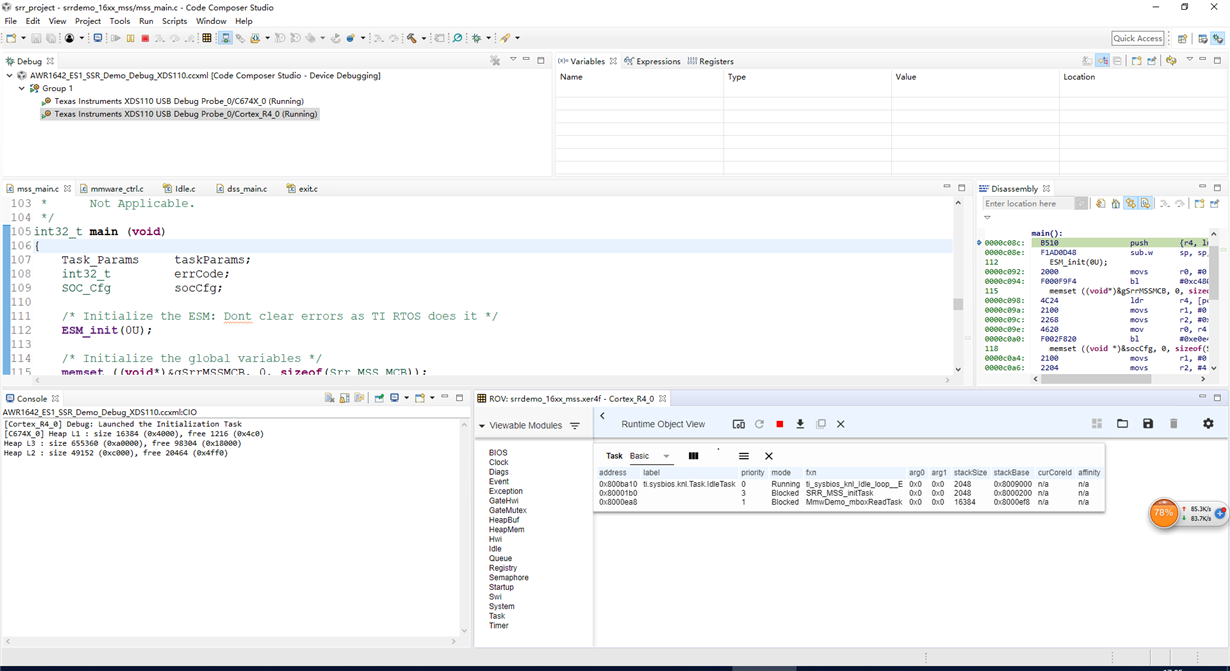 ① AWR1642板子使用XDS110调试后进调试后运行后R4F自动运行,并停止在loader_exit()函数内并在Console栏提示如下错误:
