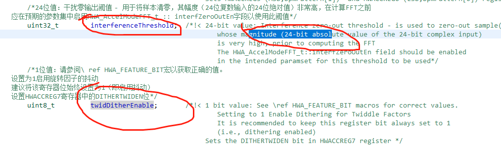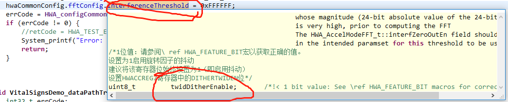 本来想看interferenceThreshold这个变量的定义和作用,将鼠标放在变量上弹出了注释小框但是显示的变量不是interferenceThreshold,而是twidDitherEnable的注释信息,通过open declaration定位到相应文件的相应位置,如下图2所示,会定位到一个莫名其妙的位置,大概在interferenceThreshold和twidDitherEnable中间,但是就是不是对的位置,请问大神该怎么解决啊?谢谢。