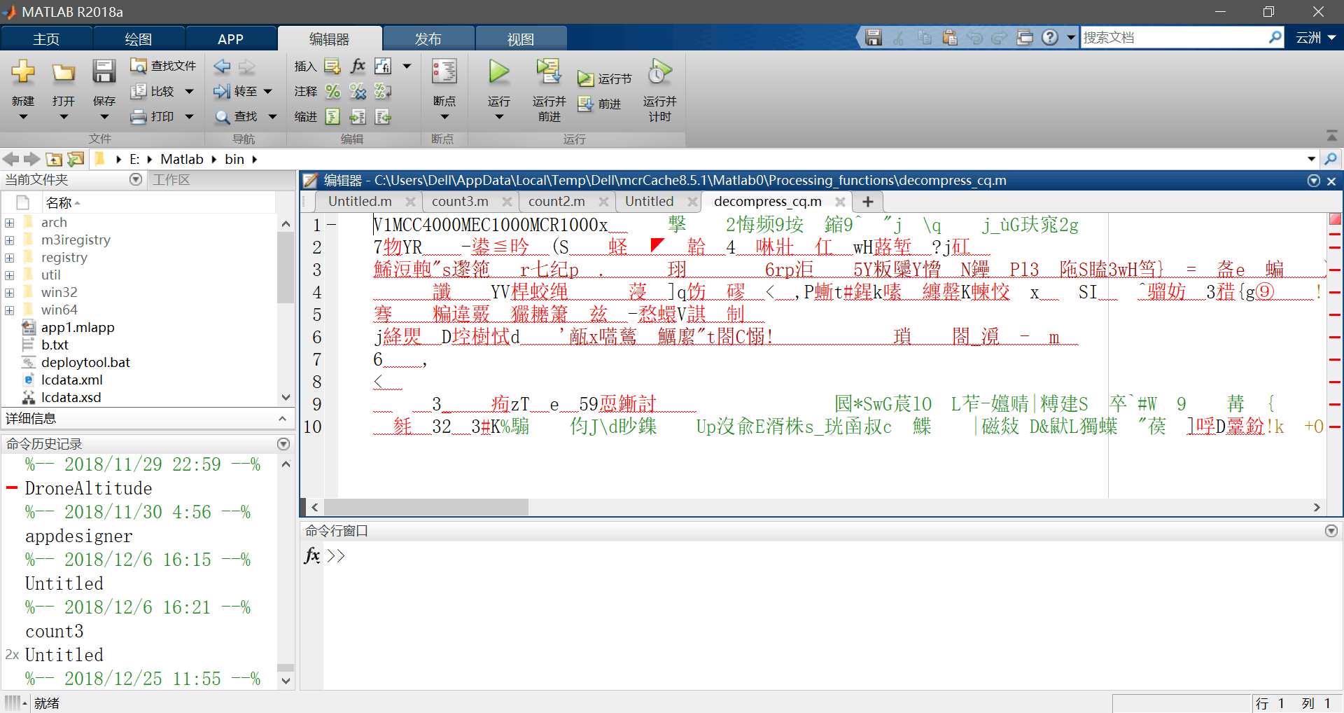 我用mmWave Studio进行数据采集处理,然后报错说是C盘里的数据处理的M文件有问题,这些文件是mmWave Studio安装时自带的,然后我用Matlab打开了该文件却显示的是乱码: