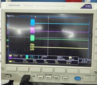 现在用DRV11873驱动一个内转子BLDC电机,电机母线电压6.1V,单项电阻为8欧姆,三项带公共端,启动电流在300mA左右。现在发现有大概15%的概率会无法启动电机,现象为电机毫不转动。观察波形后可以看到,正常启动时的波形如下图所示,可以看到电机先是开环转动,然后形成了反电动势后,再逐步切入闭环。