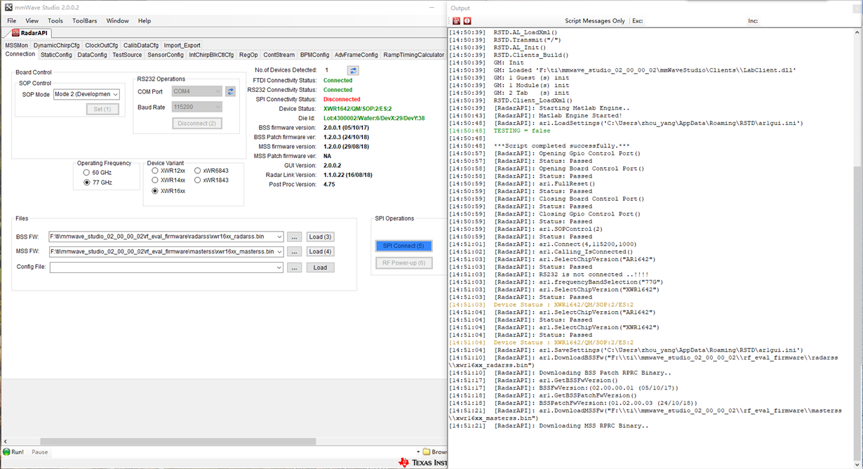 我按照TI官网中视频和资料采集IWR1642中的信号,结果SPI始终无法连接。具体情况跟:DCA100+AWR1642 ES2.0+SPI无法连接 - 其它模拟产品 - 其它模拟产品 - TI E2E™ 中文社区