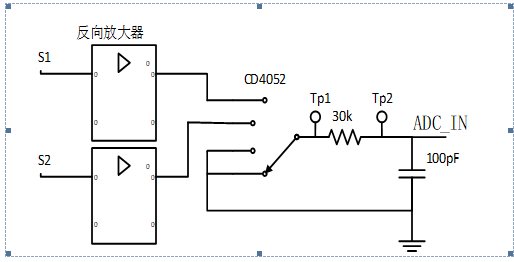 故障现象:采样电路由运算放大器、CD4052模拟开关,RC低通滤波,ADC芯片组成,各个芯片均采用+3.3V供电。信号S1、S2经过放大处理后(0~3V)连接CD4052输入端,控制CD4052选通对应的信号,并增加70us的延时后启动AD转换。