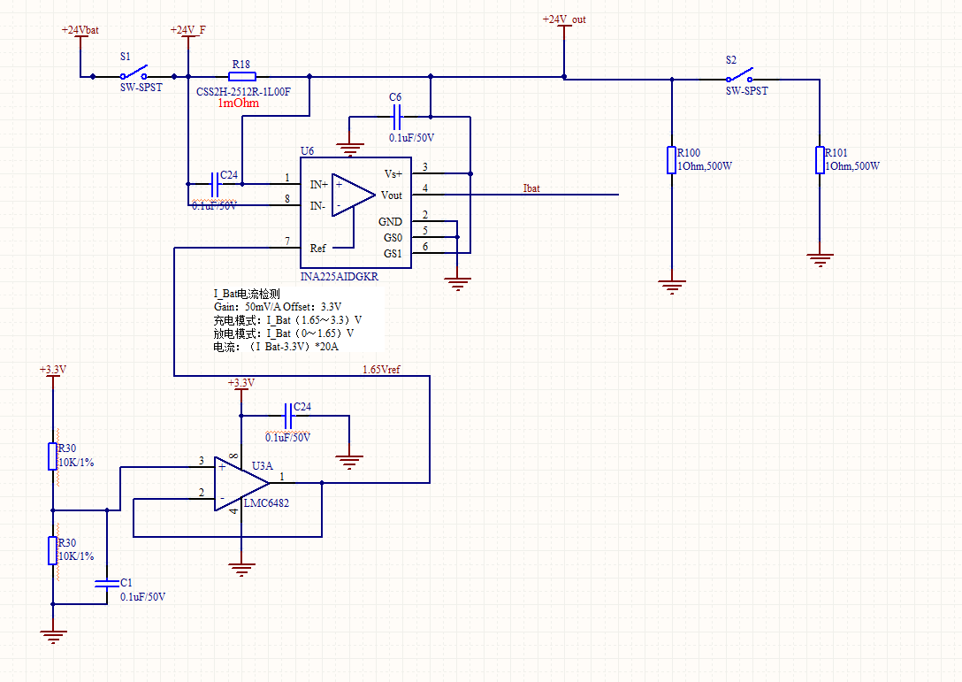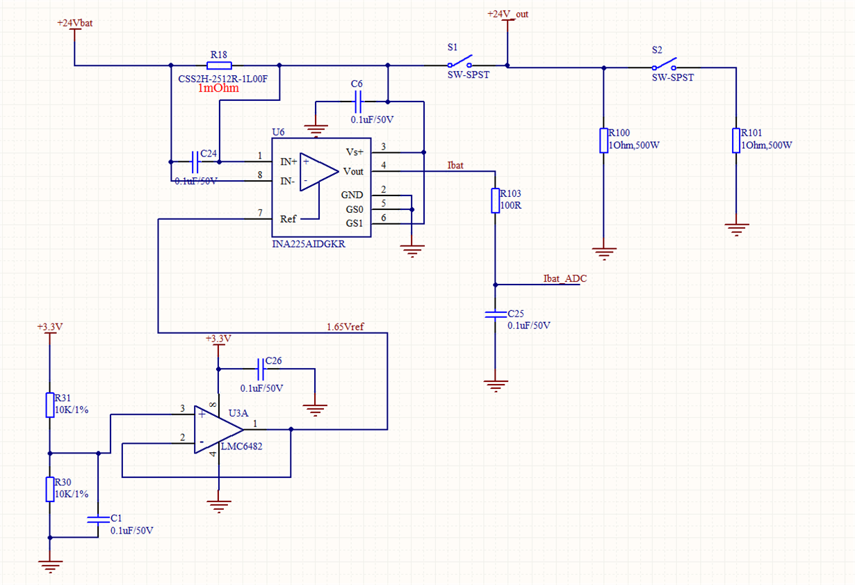 上图为电路原理图,利用INA225配合1毫欧电阻进行双向电流检测,左侧+24Vbat连接电池(22Ah 锂电池),Ibat为电流检测的输出。