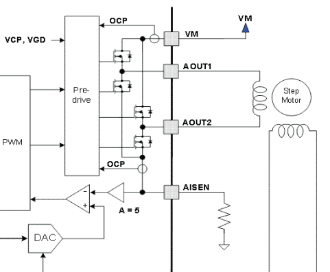 如下图内部结构(手册上截图的),假如VM=24V,电机相电流0.3A,相电压6V, 当给定0.3A的相电流时,上下MOS管的压降是不是为24V-6V再减去ISEN电阻的电压,一般ISEN电阻的电压比较小可以忽略,认为上下MOS管的压降为24V-6V=18V,岂不是两个MOS管的功耗为18V*0.3A=5.4W这么高。 如果按MOS管的导通电阻来算的话,假设单个MOS的导通电阻为250mΩ,那么两个MOS的功耗就是0.3A*0.3A*2*250mΩ=0.045W这么小。MOS管的功耗到底应该怎么算?这个原理没太弄清楚,望各位解惑。