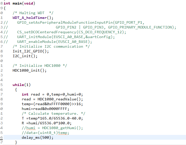 采HDC1080温湿度,每次上电只能采一次,Debug发现第一次循环没问题,第二次就一直在死在了while (I2C_isBusBusy(EUSCI_B1_BASE))处