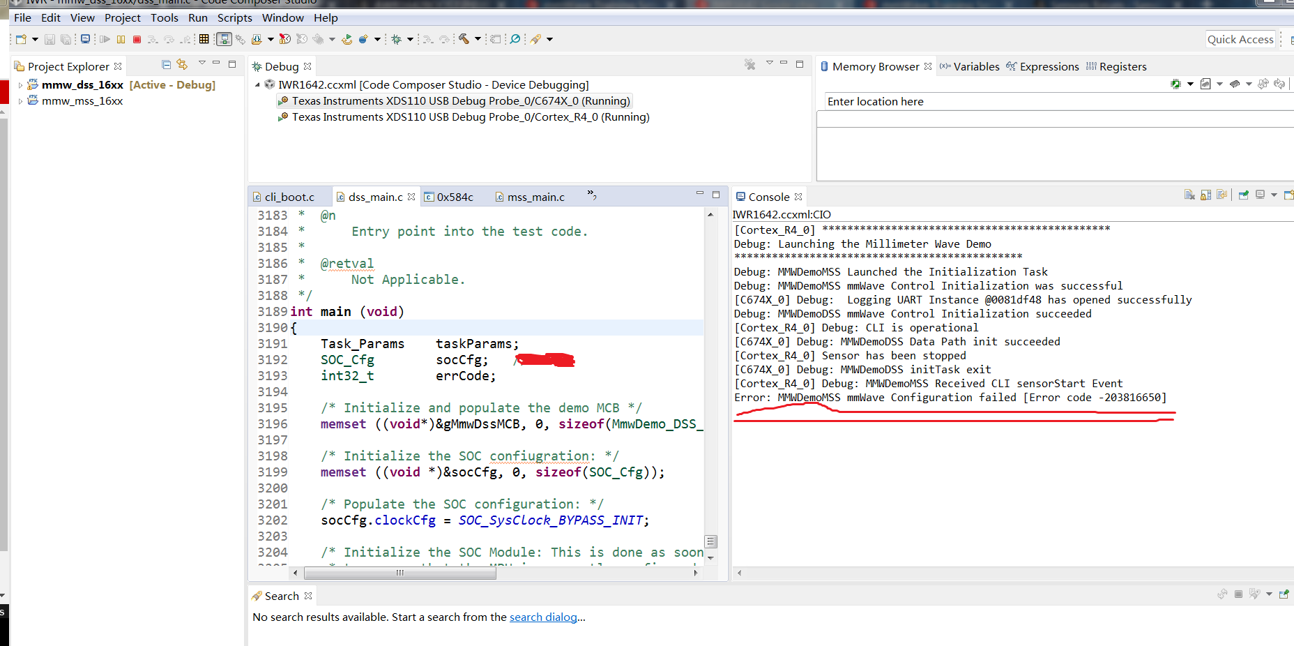 我现在手上有一块IWR1642BOOST DEMO,我修改程序可以使板子脱离上位机独立运行,参数可以手动配置,现在程序参数根据我的需要配置成相应的参数,运行后提示配置错误,如图所示配置失败,但是我该怎么查看到底是哪个参数配置失败呢?如果不知道是哪个参数配置不对的话我就不能做出相应的修改,这样显得很无措。谢谢