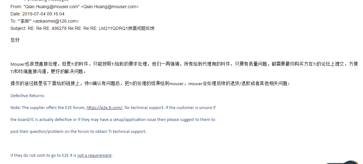 Mouser也很想直接处理,但是TI的料件,只能按照TI给到的要求处理,他们一再强调,所有给到代理商的料件,只要有质量问题,都需要最终购买方在TI的论坛上提交,方便TI和终端直接沟通,更好的解决问题。
