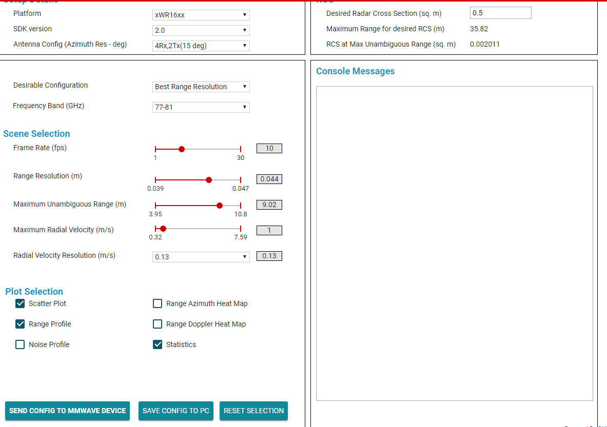 如题,按照xWR16xx的教程走到最后一步,打开可视化工具v2.1.0,选择platform之后点击发送配置,右边控制台没有任何反应,点Plots也没有数据显示(昨天还一切正常,Plots里面也能显示很多小点点和波形)。请问这是什么问题,该怎么解决呢?