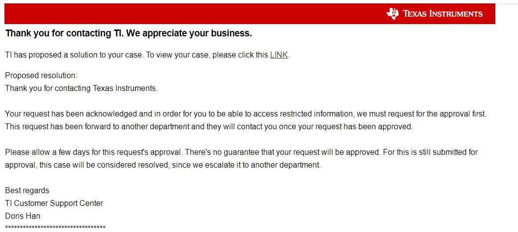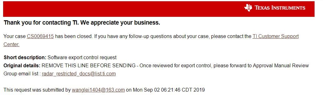 最近我们购买了加密版本的AWR1642芯片,需要使用MMWAVE-SECDEV,我在TI网站上申请了,可是过了好几天,也没有回复,不能直接下载这个sdk包;请问,要怎么才可以下载这个加密版本的sdk包。下图是,回复邮件。