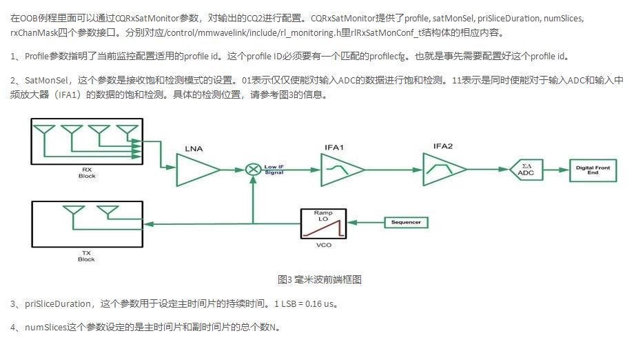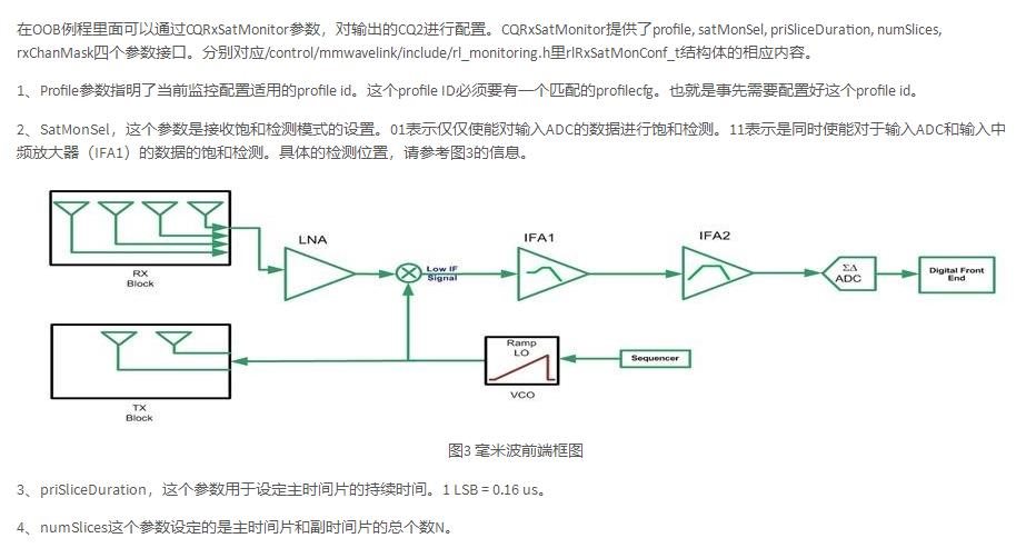 最近调试AWR1642 饱和监控功能,下图是TI论坛上的关于CQ2的说明,监控功能包括了对输入ADC数据和输入中频放大器(IFA1)的饱和监控功能,