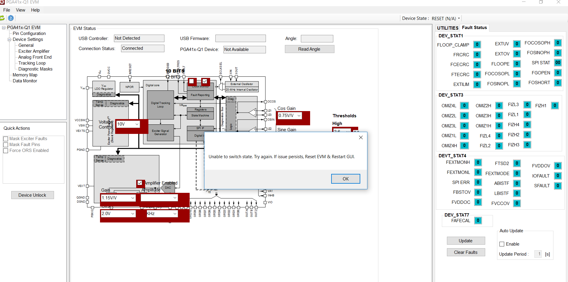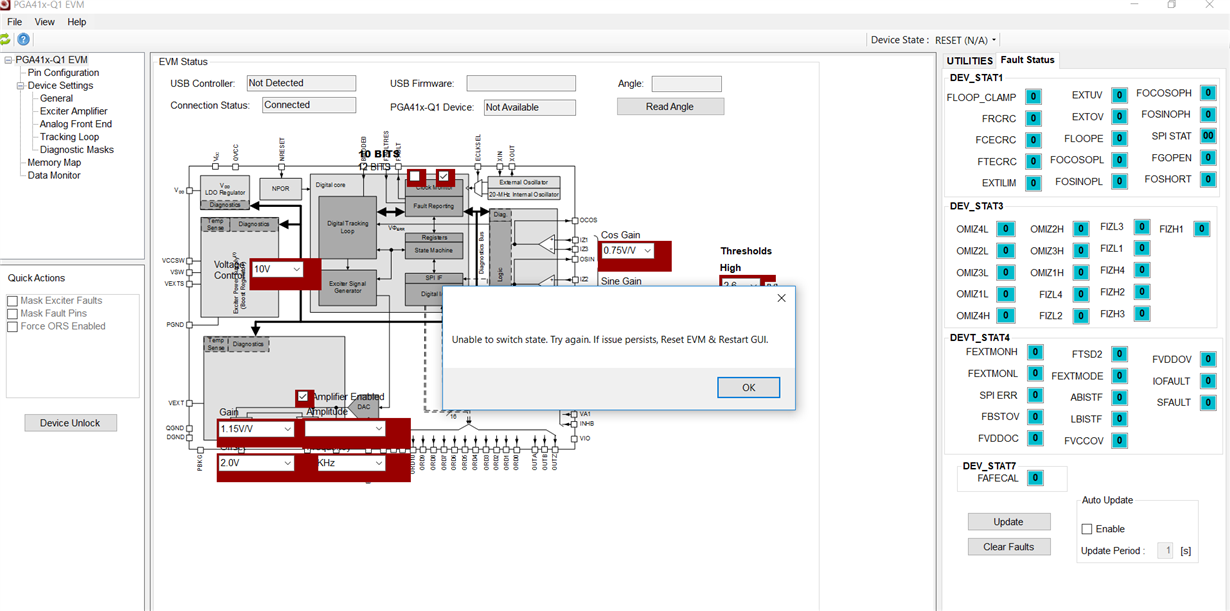 使用PGA411x Q1 EVM软件连接PGA411x Q1 EVM评估板,发现device state为RESET,且无法切换。