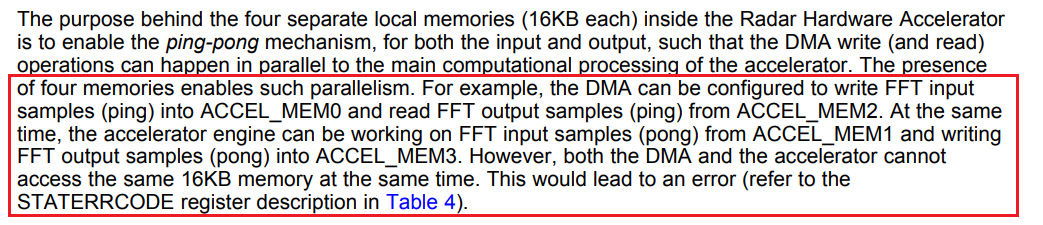 按照红框中的表述,ACCEL_MEM0是存放用于FFT处理的ADC采样值的,ACCEL_MEME2是存放FFT输出结果,为什么加速器引擎处理的采样信号是来自ACCEL1,而不是ACCEL_MEME0呢?同时为什么FFT输出结果是写入ACCEL_MEME3,而不是ACCEL_MEM2?