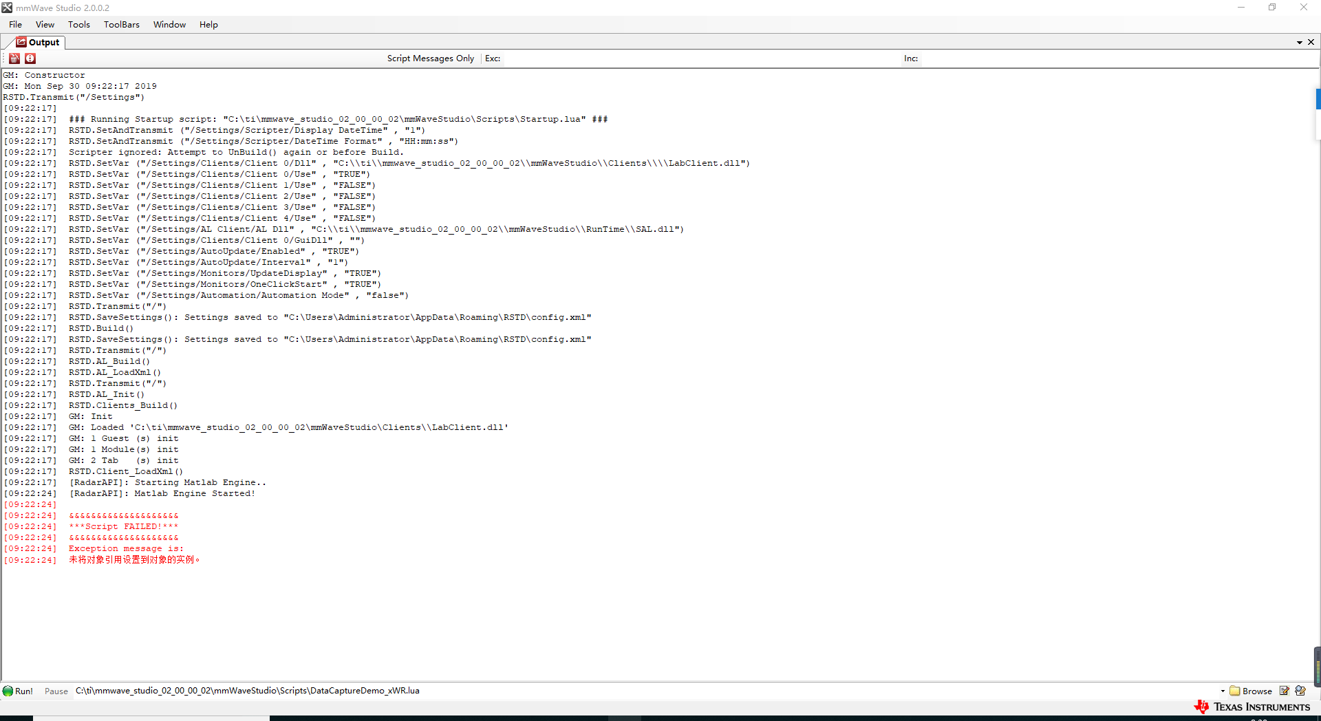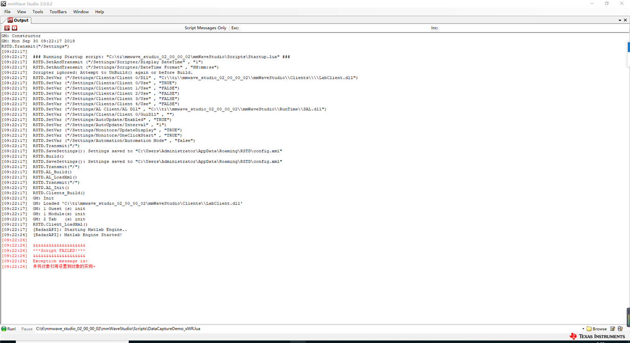 当我打开mmwave studio并遵循用户指南的安装步骤时,出现以下问题,但是当我打开mmwave studio时,没有带有Radar api的窗口,第二个窗口位于输出窗口中。错误,请帮我解决这个问题,谢谢