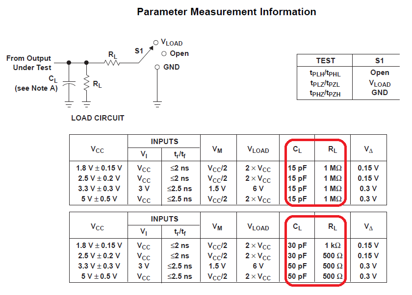 我们在SN74LVC1G04规格书中看到下图测试条件中CL为15pF时RL为1MΩ,CL为30pF时RL为1KΩ,CL为50pF时RL为500Ω,我想知道,容性负载与阻性负载为什么这样匹配?在CL为15pF情况下,将RL使用500Ω,对器件或对电路有什么影响?另在3.3V供电,频率为10MHz,只使用RL,且RL为50Ω情况下,对器件的长期可靠性有什么影响?
