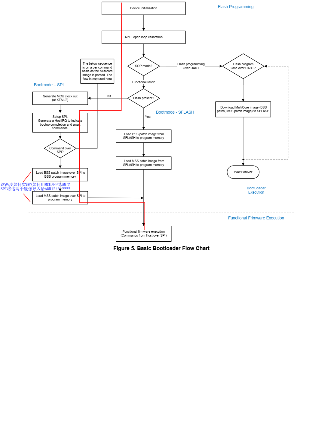 我想根据swra561a.pdf文档Figure5中提及的Bootmode-SPI方式,利用板上的一颗MCU或FPGA来实现,按照图中红色的直线顺序进行。不要使用PC机和各种studio/DFP等工具或软件。请问如何实现用MCU/FPGA通过SPI将这两个镜像导入给AWR1243 ?