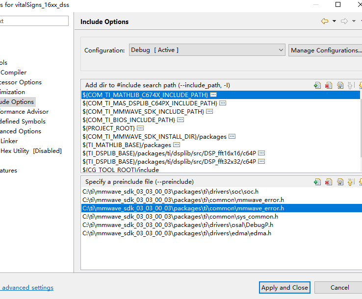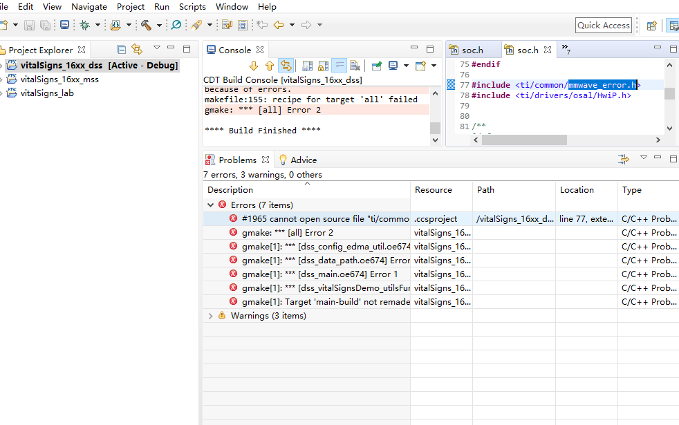 在options里定义了绝对路径,在程序里就不要在用路径了,否则路径重复定义了,试试直接#inlcude <mmwave_error.h>